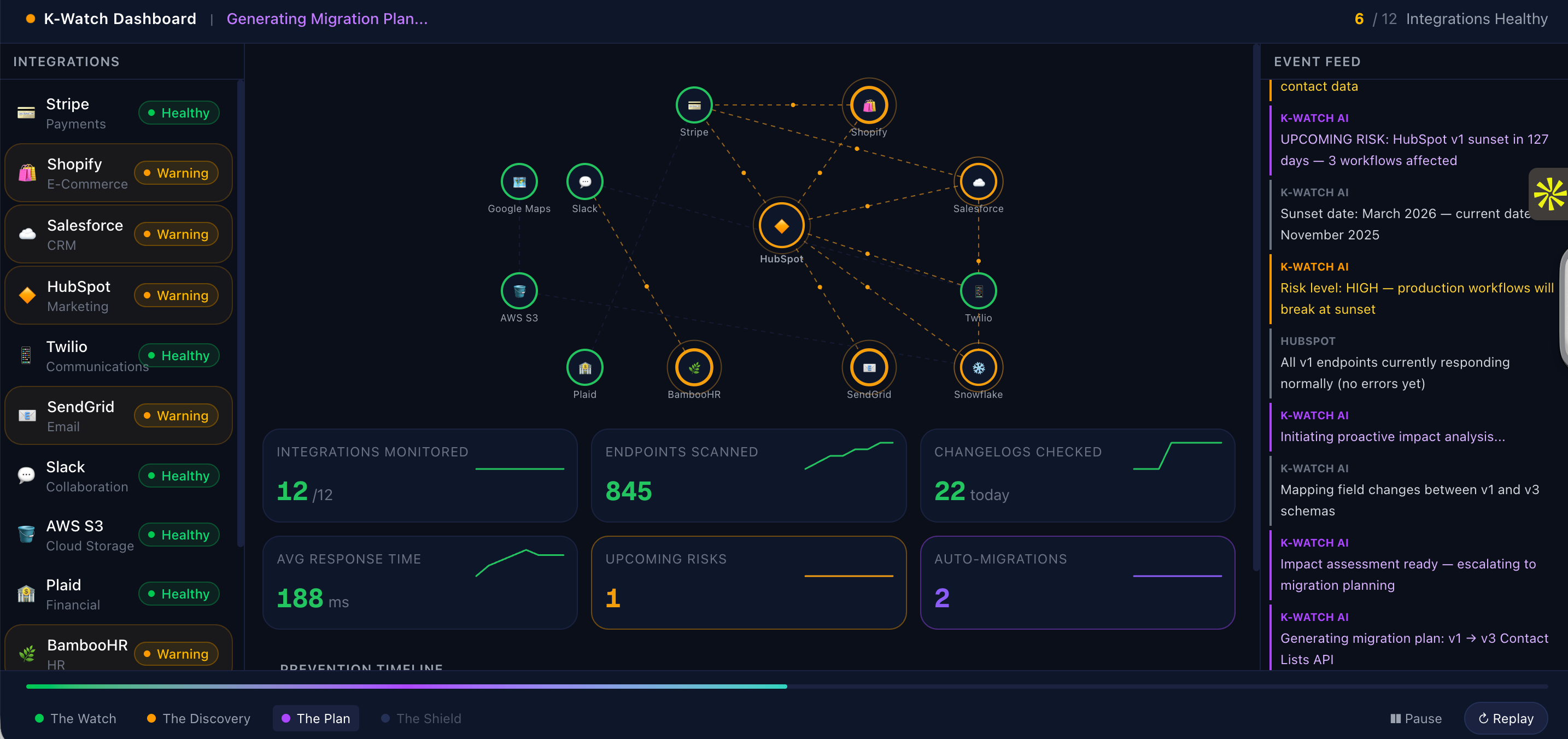 If you have more than 10 integrations you maintain for your product or within your enterprise, consider using Kelsus’s newest productized service, K-watch to monitor API changes and automatically plan and develop updates. More info at k-watch.ai.
